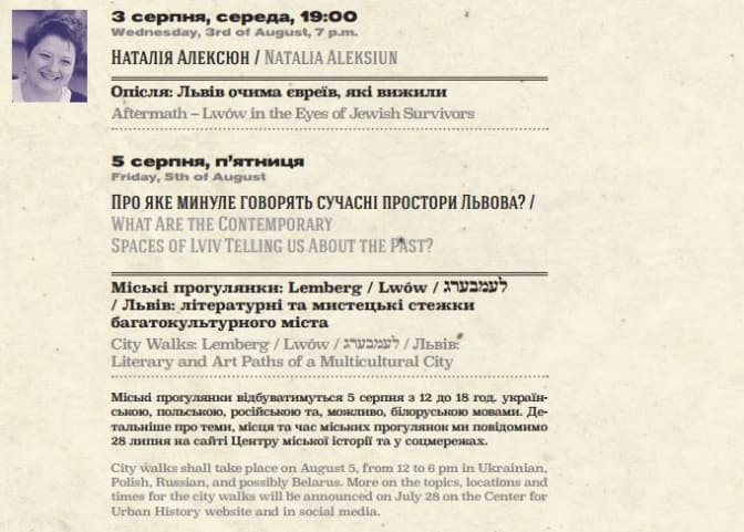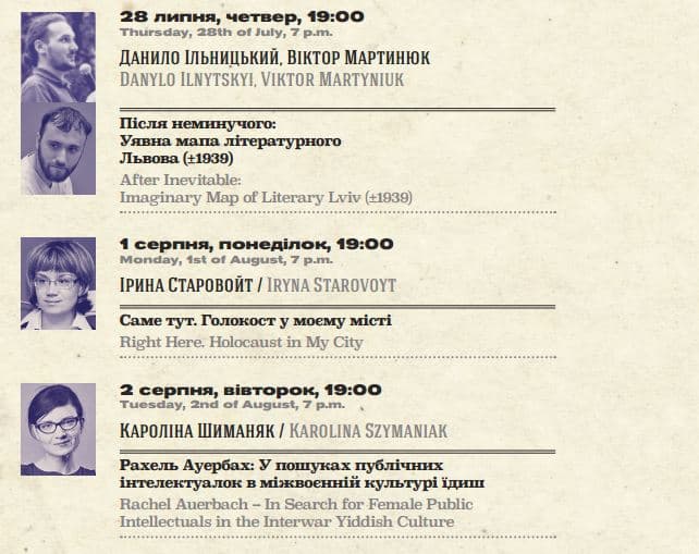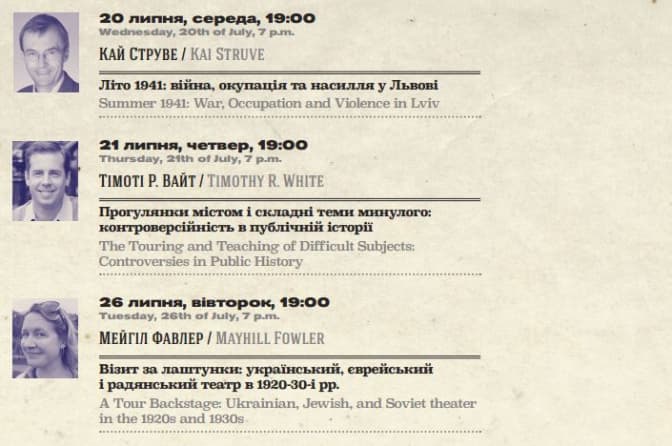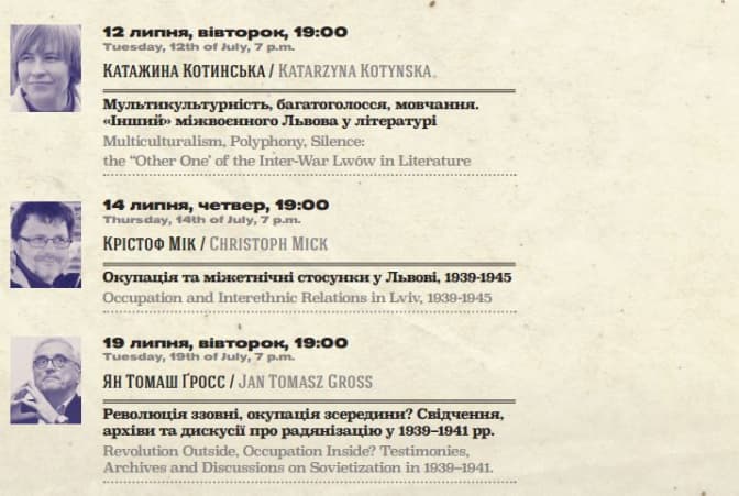 Нагадаємо, гостьовими лекторами і доповідачами стануть також Крістоф Мік (Ворвікський університет, Великобританія), Кай Струве (Галле-Віттенберзький університет ім.Мартіна Лютера, Німеччина), Ян Томаш Гросс (Прінстонський університет, США), Тімоті Вайт (Міський університет Нью-Джерсі, США), Мейгіл Фавлер (Університет Стетсона, США), Данило Ільницький, Віктор Мартинюк (Інститут українознавства ім. І. Крип'якевича НАНУкраїни, Львів), Кароліна Шиманяк (Вроцлавський університет / Єврейський історичний інститут, Варшава), Ірина Старовойт (Львівський національний університет ім. Івана Франка), Наталія Алєксюн (Туро коледж, США).