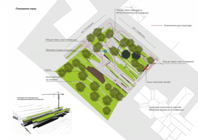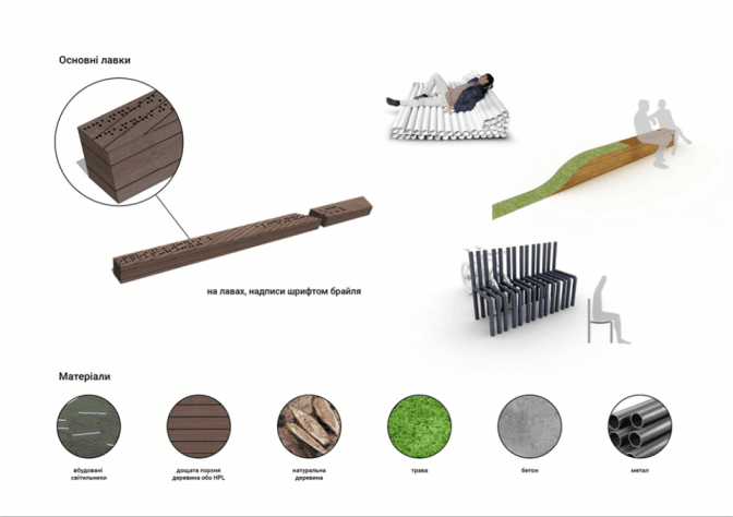 Проект переможців передбачає створення інтерактивного громадського простору з функціями імпровізованої сцени, груп лавок, зони схилу з сидіннями, паркуванням велосипедів, арт-об’єктом «нерв», арт-об’єктами з дерева та металу, різнопланового освітлення. Виглядатиме він наступним чином: