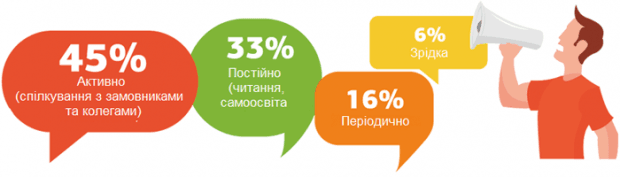 На додаток до гарної технічної освіти, українські ІТ-спеціалісти переважно займаються самоосвітою та особистісним розвитком: 81% айтішників продовжують самоосвіту, ще 16% – відвідують тренінги. Серед іншого – курси іноземних мов, вища або ж друга вища освіта