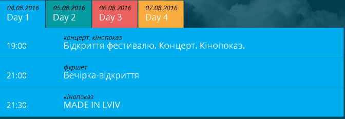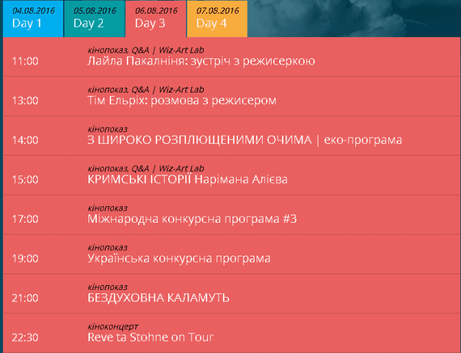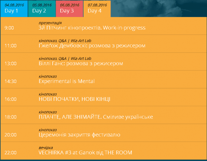 Офіційне відкриття фестивалю відбудеться 4 серпня у Львівській обласній філармонії. Глядачі зможуть подивитись підбірку коротких метрів – фестивальних хітів, та насолодитись аудіовізуальним перформансом MANU.