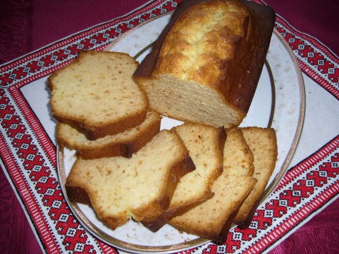 Приготування. Розтерти в мисці жовтки з цукром на пухку масу (півгодини), додати олію й терти дальше. Окремо загріти мід і трохи підсмажити (вважати, щоб не збіга бо не підгорів), простудити і вляти до маси. Терти дальше, додати цитринової шкірки (на кінець ножа), всипати муку. В ложці води розпустити порошок, вляти й добре вимішати. Вбити білки на шум і легко вимішати. Масу вляти в подовгасту форму і пекти при 180˚С півгодини, щоб тісто зарум’янилось, але не підгоріло.