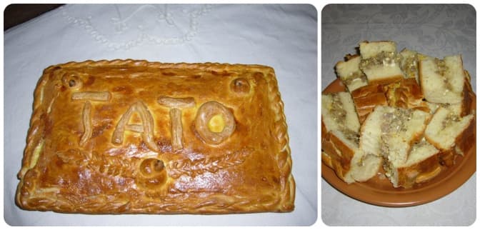 Із третьої частини розтачати тонкі валочки, із яких виплести край пирога і виписати ім’я іменинника. Пиріг у блясі лишити ще на півгодини, накривши його. Коли підросте, помастити розколоченим яйцем і поставити на 180˚С та пекти годину. По 3/4 год. можна підсунути на 200 С˚, щоб пиріг гарно зарум’янився.