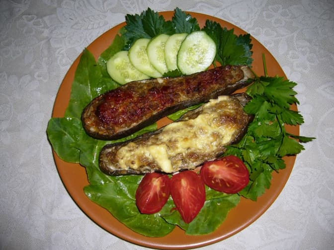 Приготування. Розрізати вздовж баклажана, вийняти середину, залишаючи шкаралущу на півінча (одиниця виміру, що складає дванадцяту частину фута. Інч (дюйм)=2,54 см. Відповідно півінча=13 мм) завгрубшки і пропарити її солоним окропом. М'якуш із баклажана посікти й у мисці вимішати з цибулею, рисом або тертими сухарями, часником, м'ясом і яйцем. Посолити й поперчити до смаку і злегка вимішувати, поливаючи оливою. Вложити масу в вижолоблені й пропарені (можна також 5 хвилин поварити в окропі) половинки баклажана, полляти помідоровою гущею або сметаною і запекти у печі на 200°С около півгодини. Можна подати для чотирьох осіб.