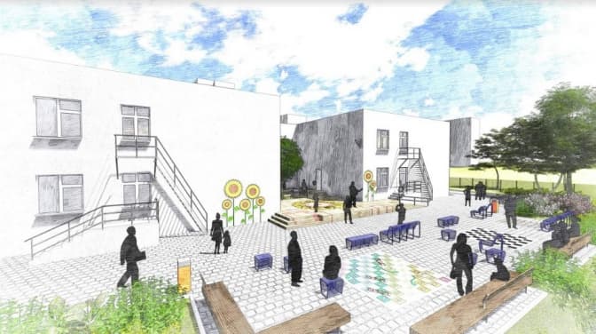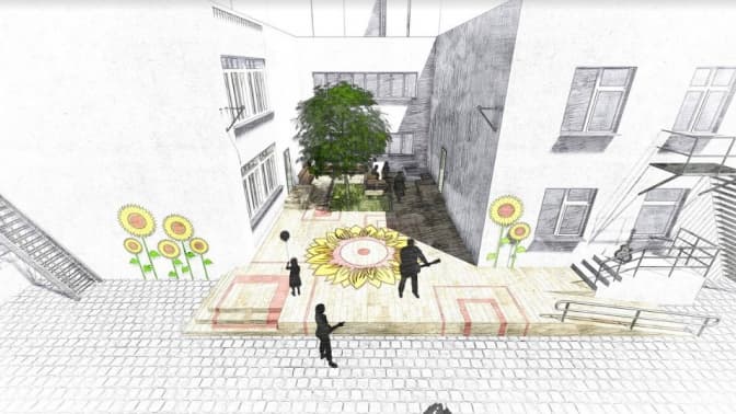 «Наші неймовірні Олена Зварич та Христина Чорноус на замовлення Andriy Shevtsiv розробили проект подвір'я зі сценою для Будинку дитячої та юнацької творчості Франківського району на Науковій 17», – пише на своїй сторінці у Facebook заступник директора департаменту розвитку міста Олександра Сладкова.