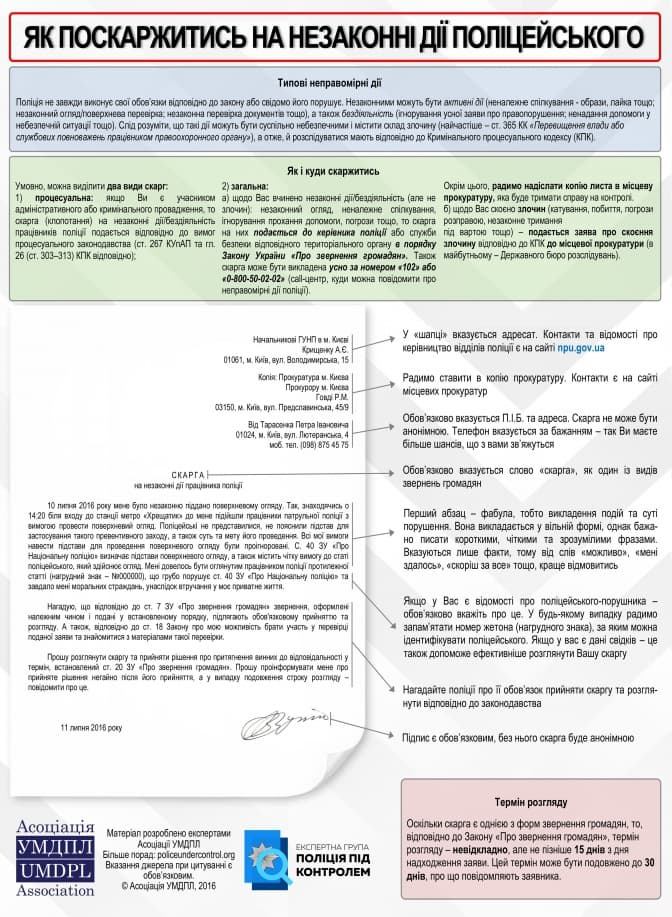 Інструкція містить інформацію про типові неправомірні дії співробітників поліції, а також описує, як, у якому порядку і куди скаржитися.