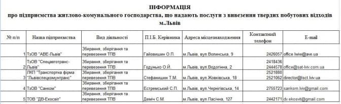 5. Контакти підприємств, які вивозять сміття у Львові: