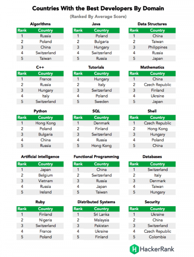 Очолює рейтинг найкращих програмістів Китай. У першу п'ятірку також увійшли Росія, Польща, Швейцарія та Угорщина.