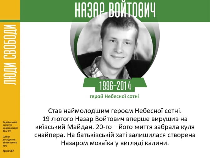 «Проект «Люди Свободи» – це не лише виставка. Це також і відеоролики, й інформаційні матеріали. Оскільки цього року ми відзначили 25-річчя Незалежності України, то вирішили обрати 25 персоналій, які боролися за свободу і незалежність у XX столітті. 26-ий – Назар Войтович, наймолодший із Героїв Небесної сотні. Таким чином хотіли продемонструвати, що боротьба продовжується і в наш час», – розповів Tvoemisto.tv Ярослав Файзулін, один із авторів проекту, співробітник Українського інституту національної пам’яті.