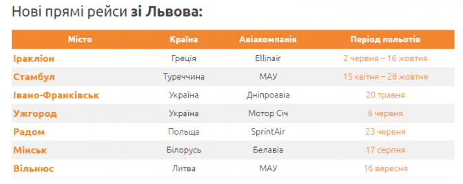 Цьогоріч Львів з’єднали прямим авіасполученням із такими країнами: Греція, Туречччина, Польща, Білорусь та Литва, – повідомляє lowcostavia.com.uа. Окрім того, запровадили два нові внутрішні рейси в межах України – до Ужгорода та Івано-Франківська.