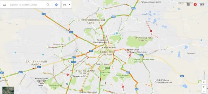Згідно з даними Google Maps, станом на 08:15 год. затори у Львові є на вулицях: