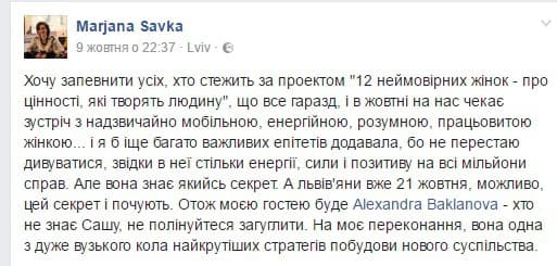 У жовтні співрозмовницею Мар’яни Савки стане Олександра Бакланова – відомий громадський діяч (віце-президент AIESEC, засновниця луганського представництва організації) та консультант зі стратегій та управління змінами (модератор навчальних програм для більш ніж 30 конференцій, інтерактивних семінарів та тренінгів в Україні та за кордоном), експерт з питань комунікацій, маркетингу та стратегій.