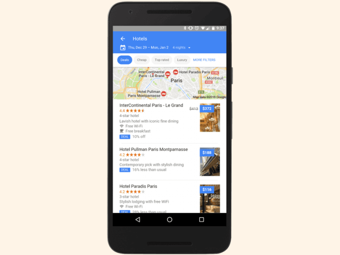 Окрім того, сервіс «Google Flights» допомагає із пошуком готелей за вибраним маршрутом. На карті з'являтимуться пропозиції з акційними пропозиціями, запропонованими у потрібний користувачу час. Увімкнути таку функцію можна у лівому верхньому куті екрану з позначкою «Deals», де потрібно відфільтрувати додатки.