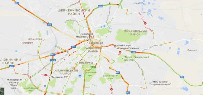 Згідно з даними Google Maps, станом на 08:15 год. затори у Львові є на вулицях:
