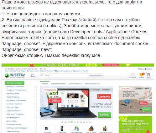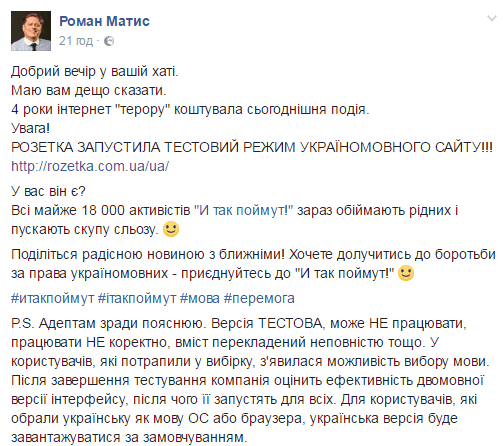 26 жовтня, вперше за багато років, інтернет-магазин "Rozetka.ua" запустив україномовну тестер-версію сайту. Як розповів Роман Матис, засновник та керівник "И так поймут", ініціатива з приводу цього розпочалась ще у 2012 році: