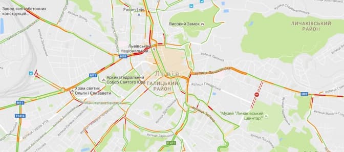 Згідно з даними Google Maps, станом на 08.15, затори у Львові є на вулицях: