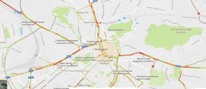 Згідно з даними Google Maps, станом на 08:15, затори у Львові є на вулицях: