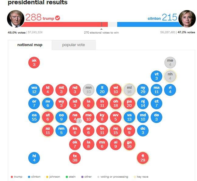 Відтак, станом на 10 годину за київським часом, Дональд Трамп отримав 218 голосів. Його опонентка від «Демократичної партії» Хілларі Клінтон – 215. У виборчому штабі останньої заявили, що продовжать підрахунок голосів, хоча на результати він вже не вплине.