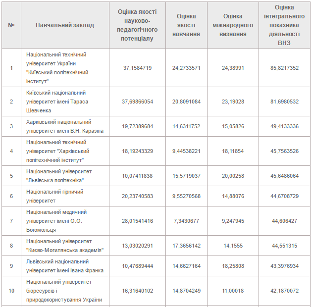 Друге місце у рейтингу посів Київський національний університет імені Тараса Шевченка. Третє і четверте місця посіли харківські ВНЗ, відповідно - Національний університет ім. Каразіна та Національний технічний університет «Харківський політехнічний інститут».