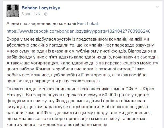 У холдингу «!Fest» Tvoemisto.tv підтвердили, що компанія погодилася на умови Богдана Лозицького, та повідомили, що найближчими днями приймуть рішення щодо перерахування коштів на рахунок одного з фондів. Співвласник компанії Андрій Хурдо зазначив: "Ми вирішили, що не варто обирати з переліку фондів, запропонованих Богданом, бо кожен з них робить потрібну справу, і всі ці справи однаково важливі. Тому вчинили так: кожен з чотирьох фондів отримав рівну частину від 50 тис. Таким чином, всі вони отримали підтримку".