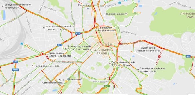 Згідно з даними Google Maps, станом на 8.15, 25-го листопада затори у Львові є на вулицях: