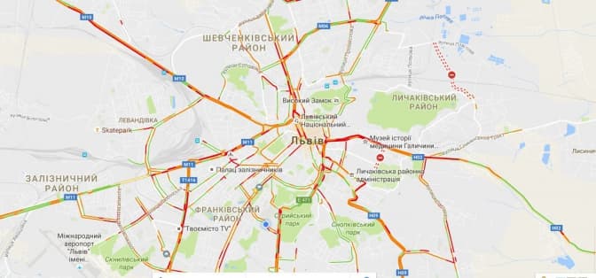 Згідно з даними Google Maps, станом на 8:20 затори у Львові є на вулицях: