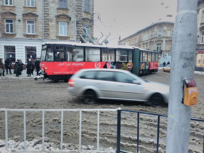 По вулиці Городоцькій, бо біля церкви Ольги і Єлизавети трамвай зійшов з рейок.