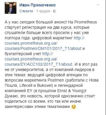 Особливістю нових курсів є те, що лекторами будуть не викладачі університетів, а практики з провідних українських компаній, – повідомив на своїй сторінці у Facebook співзасновник Prometheus Іван Примаченко.