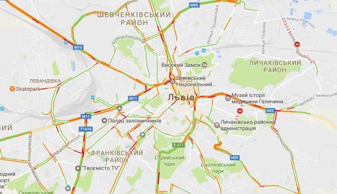 Згідно з даними Google Maps, станом на 8.15 6-го грудня затори у Львові є на вулицях: