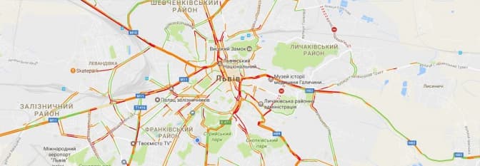 Згідно з даними Google Maps, станом на 8:40 затори у Львові є на вулицях: