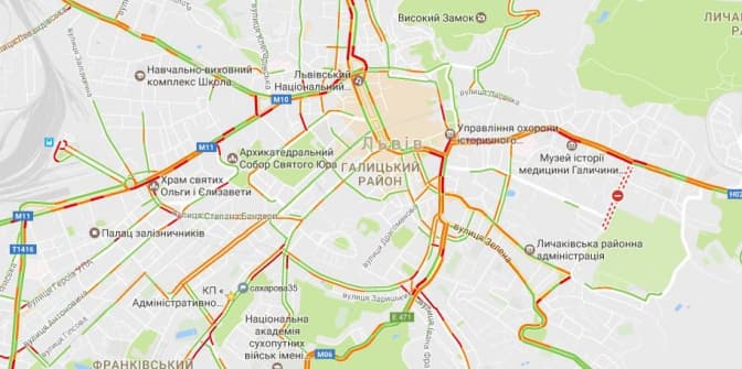 Згідно з даними Google Maps, станом на 8.25 9-го грудня затори у Львові є на вулицях: