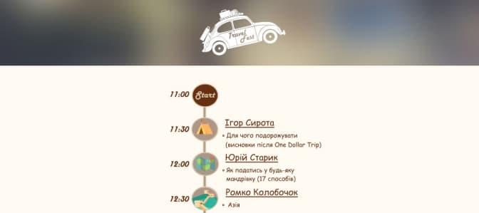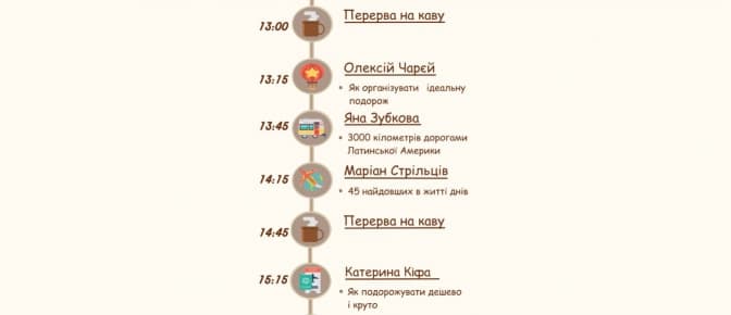 «Travel fest – це 6 годин спілкування з відомими мандрівниками, які ділитимуться досвідом щодо того, як отримати насолоду від подорожі, витративши на це мінімальну кількість грошей, – зазначають організатори. – На вас чекатимуть практичні поради від 8-х шалених мандрівників, серед яких: київський дитячий супергерой Вова Клєвер, автор блогу «Тут був я» Маріан Стрільців, юний Магеллан Ігор Сирота та багато інших».
