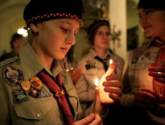 Пластуни передають Вифлеємський вогонь. Фото:pmg.ua