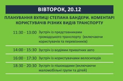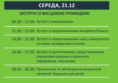 Тому 19-го грудня відбудеться презентація 3-х проектів облаштування, 20-го грудня – зустрічі з власниками різних видів громадського та приватного транспорту, 21-го грудня – обговорення ідей з місцевою громадою.