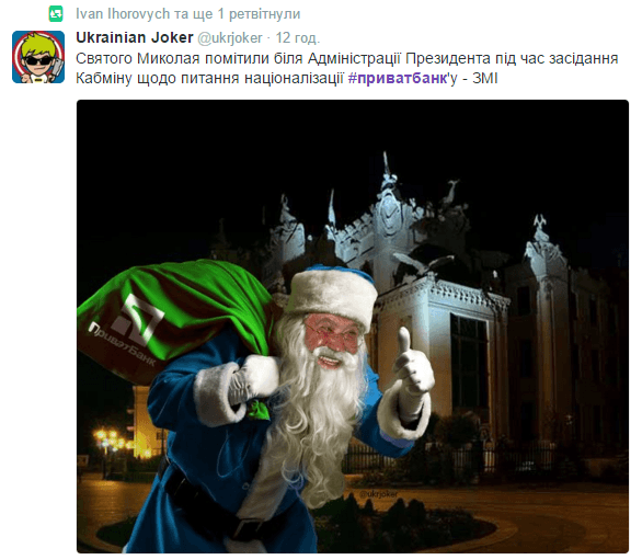 Націоналізацію "Приватбанку" не один користувач соцмережі назвав подарунком Святого Миколая Україні.