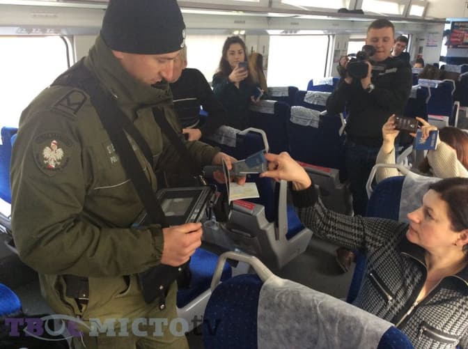На першому рейсі Київ - Львів - Перемишль працювало 18 львівських прикордонників, 5 митників та кінологи з двома службовими собаками – одна шукає вибухівку, інша наркотики. Прикордонники оформлюють документи за допомогою мобільних приладів паспортного контролю. Цей процес триває кілька хвилин. А ось у тих, хто має біометричні паспорти, ще беруть відбиток пальця. Українські прикордонники документи перевіряють до польського кордону, на станції "Мостиська 2" потяг зупиняється і вони виходять. Туди ми прибули о 13:15.