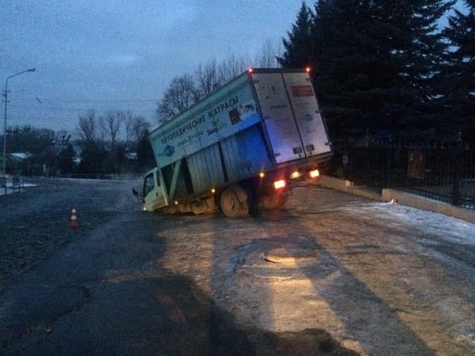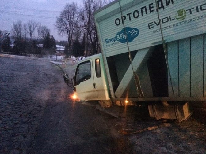 Вантажівка поступово продовжує провалюватися, також стався великий витік з каналізаційних труб на дорогу.