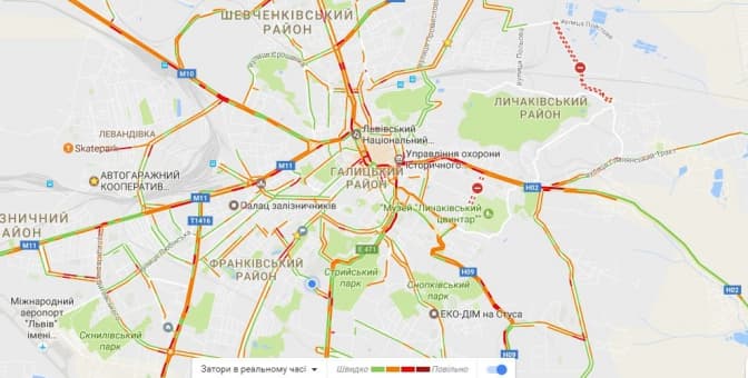Згідно з даними Google Maps, станом на 8:40 затори у Львові є на вулицях: