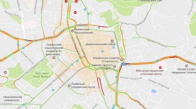 Згідно з даними Google Maps, станом на 8.25 6-го січня затори у Львові є на вулицях: