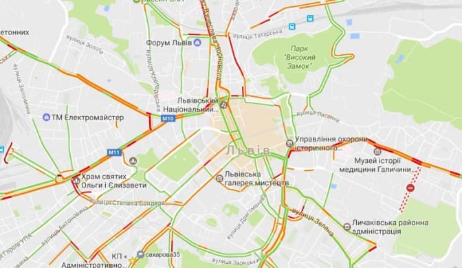 Згідно з даними Google Maps, станом на 8.25 11-го січня затори у Львові є на вулицях: