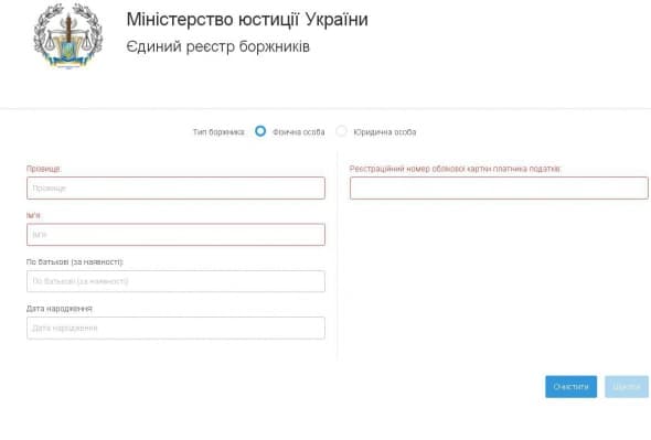 Щоб дізнатися розмір боргу, потрібно ввести дані в спеціальну форму на сайті реєстру - ім'я, прізвище, по батькові, дату народження і номер ідентифікаційного коду або реєстраційний номер облікової картки платника податків.