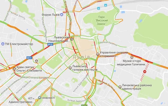 Згідно з даними Google Maps, станом на 8.20 12-го січня затори у Львові є на вулицях: