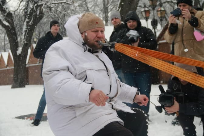 Олег Тягнизуб встановив свій ювілейний – десятий – рекорд, протягнувши зубами сани вагою майже 500 кг. За 68 секунд силач зумів пересунути сани, у яких знаходилися люди, на 21 метр.
