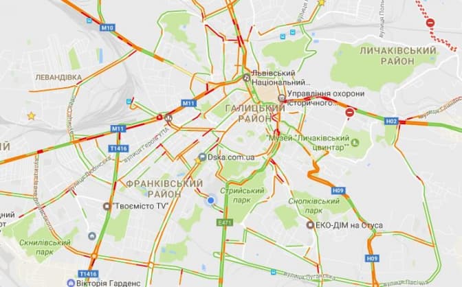 Згідно з даними Google Maps, станом на 8.20 17-го січня затори у Львові є на вулицях: