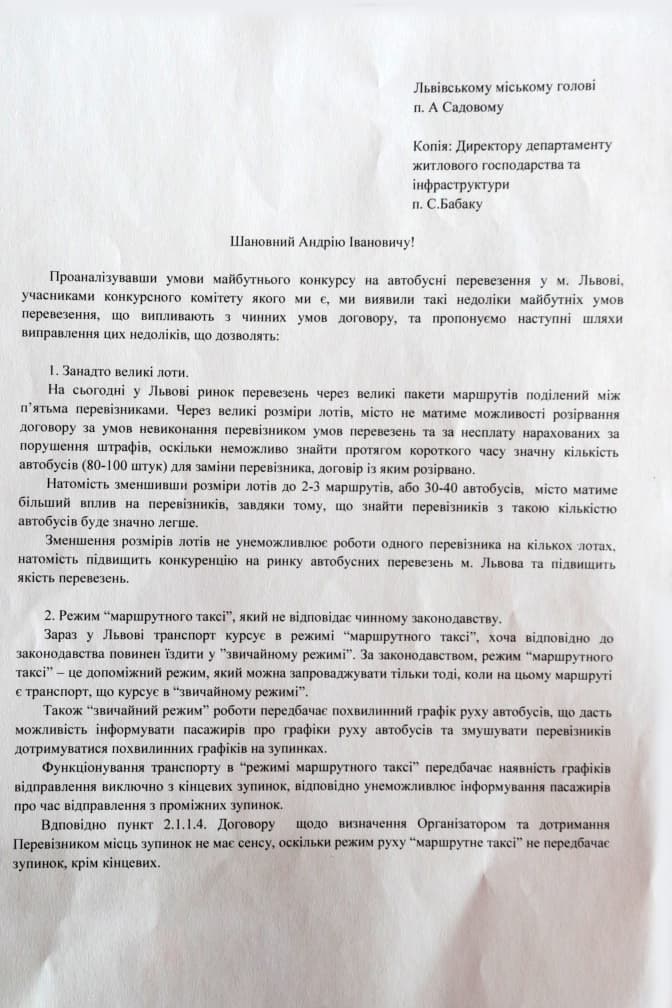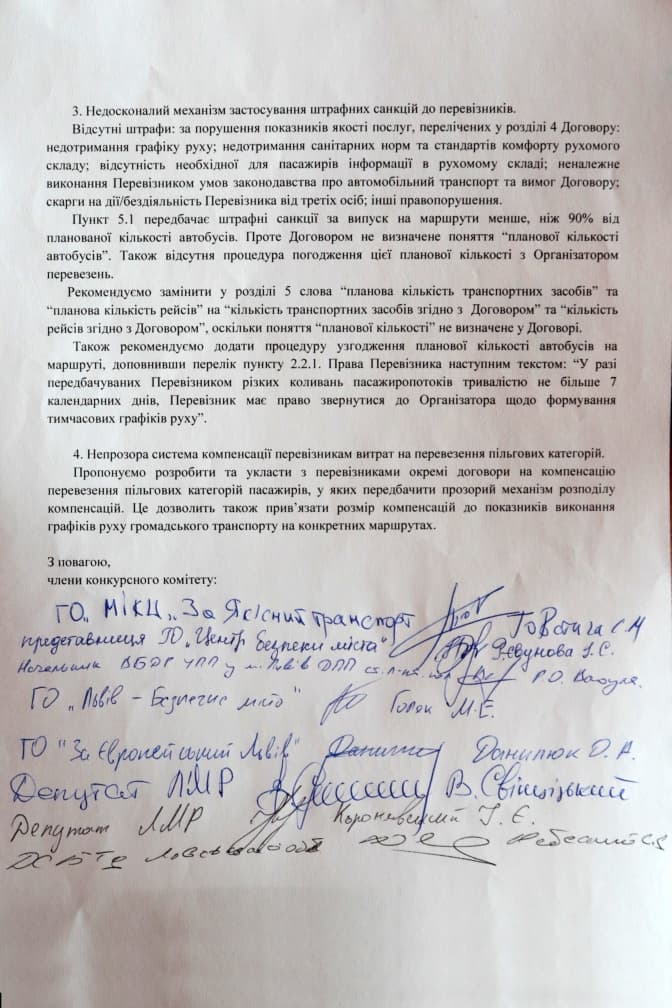 Представники громадськості сформулювали Звернення до міського голови з проханням внести зміни до договору з перевізниками в 4-х пунктах: зменшити занадто великі лоти, щоб місто мало більший вплив на перевізників і в разі розірвання договору могло швидко знайти іншого; запровадження «звичайного режиму», а не режиму маршрутного таксі; удосконалення штрафних санкцій у разі невиконання договору й визначити прозорі умови компенсації коштів за перевезення пільгових категорій.