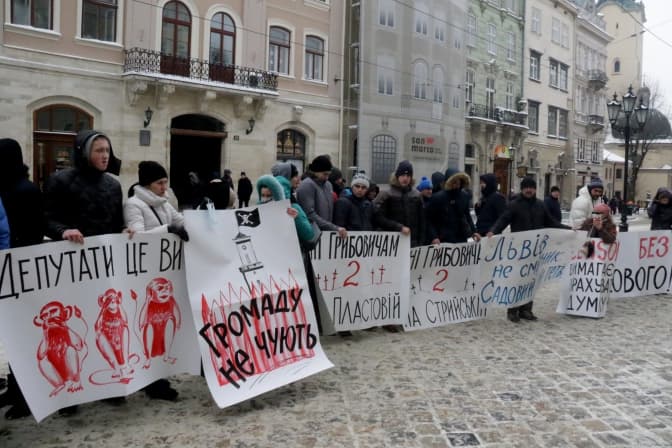 На площі Ринок біля Львівської міської ради зібралися приблизно 150-200 активістів. Принесли плакати з написами «Ні – Грибовичам на Білогорщі», «Львів – не смітник», «Львів – дітям без сміття», «Ні – Грибовичам на Пластовій», «Вимагаємо врахувати думку» тощо. Сесію не закрили і не перенесли, засідання триває. Мітингувальники передали депутатам свої вимоги і розійшлися.