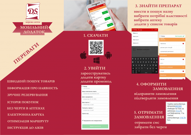 Додаток «Мережа аптек D.S.» (iOS, Android, Windows) можна безкоштовно завантажити тут.