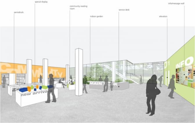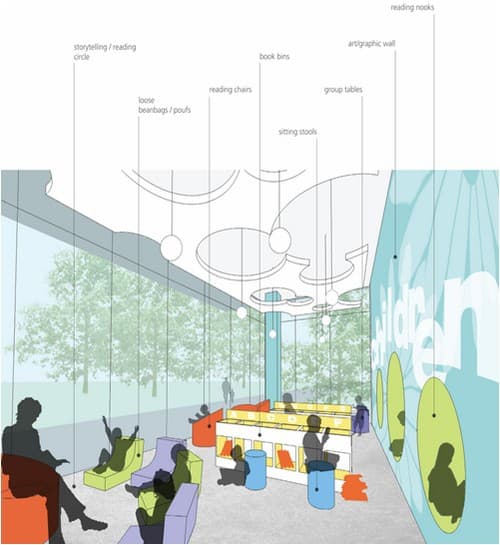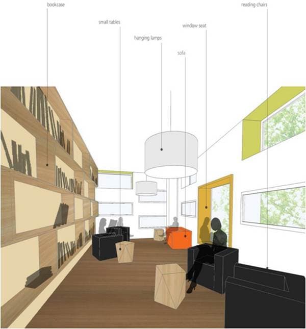 У п’ятиповерховій будівлі буде три тераси – дві відкриті та одна напівзакрита. На горішньому поверсі – засклена вітальня з виглядом на Стрийський парк. Усередині – невеликий зелений майданчик із місцями для сидіння. Весь перший поверх засклений. Також у центрі обладнають місця усамітнення, де відвідувачі зможуть насолоджуватись виглядом із вікна. Меблі в центрі будуть якомога мобільніші. «Все для того, щоб студенти й відвідувачі могли трансформувати простір у кімнатах відповідно до роду занять. Вони зможуть розставляти столи і стільці так, аби зручно розміститись навколо модератора презентації. Чи, наприклад, сісти на килимі й декламувати вірші», – розповідає Олег Яськів.
