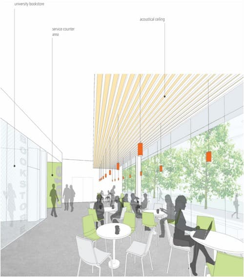 У комплексі буде невелике снек-кафе та крамничка, де продаватимуться книжки видавництва УКУ та сувенірна продукція університету: футболки, олімпійки, горнятка та канцелярські товари для студентів.
