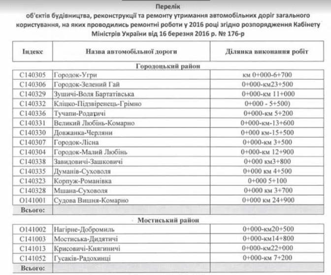 Юрій Яблонський, т.в.о. начальника Служби автомобільних доріг Львівщини, у відповідь на інформаційний запит надав для Tvoemisto.tv перелік доріг області, на яких провели ремонтні роботи в 2016-му році за рахунок коштів, передбачених розпорядженням Кабінету Міністрів України від 16.03.2016 р. №176-р, та за рахунок коштів, залучених у попередні роки під державні гарантії Державним агентством автомобільних доріг.