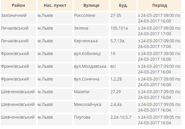 Завтра, 24-го березня, світло вимикатимуть у 4-х районах Львова.